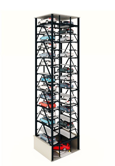 Tower Parking is an elevator-based parking system with vertical allocation of parking rooms and vertical movement of the lift.